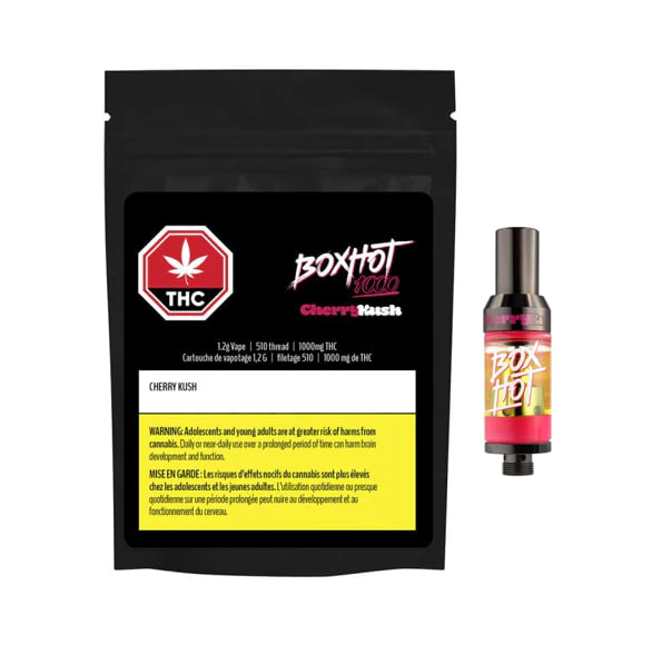 BOXHOT presents Cherry Kush, a 510 threaded vape featuring high purity cannabis distillate. This tasty titan hits big with maraschino cherry flavour and is complimented with a deep, woody and recognizable Kush flavour. Compatible with button-activated 510 batteries. All BOXHOT vapes are manufactured with exclusive, oversized hardware, making them optimized for big, full hits. Better yet, all BOXHOT vapes are produced with industry-leading CO2 extraction and refining processes and feature an entourage of expertly infused premium strain-specific terpenes.