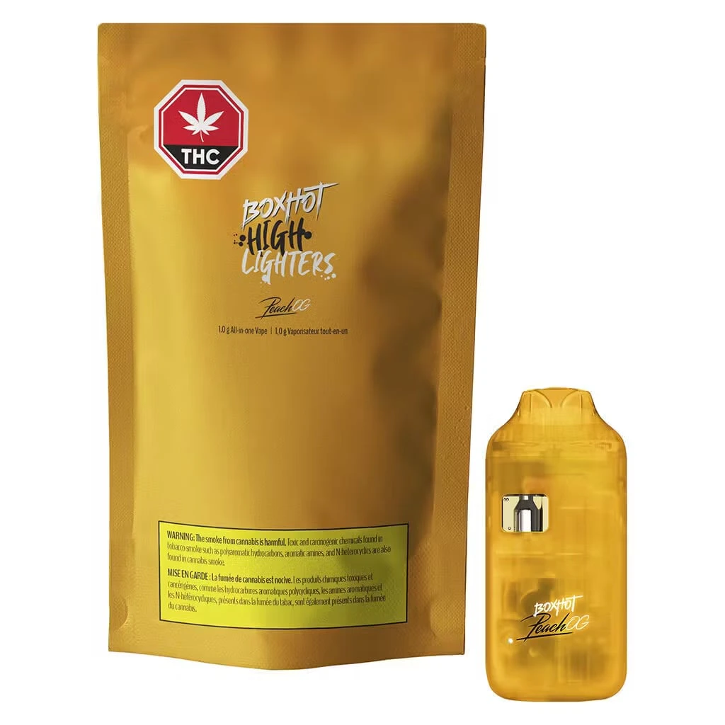 BOXHOT PRESENTS The Peach OG Highlighter, an all-in-one vape pen featuring some of the purest cannabis distillate. This sweet beast boasts a fruity aroma complemented by a complex profile of earthy undertones. BOXHOT Highlighters are equipped with rechargeable USB-C technology.
