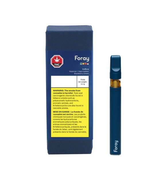 Foray's Indica 0.3 Disposable Vape Pen has fresh, leafy green notes, followed by crisp citrus. Finish is slightly dry and woody with a smooth vanilla sweetness. This high-quality distillate is in a no-leak cartridge system and is rechargeable. Battery charger not included