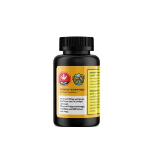 Balanced 10:10 Softgels 50-pack containing a total of 500mg of THC and 500mg of CBD. Glacial Gold Balanced 10:10 Softgels are made with organic MCT oil from coconuts and high-purity distillates from Nextleaf Labs.