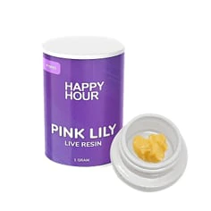 Happy Hour Pink Lily 1g Live Resin is a balanced hybrid bred from Pink Grizzly x Lillooet Landrace. Grown by Back Country in Lillooet and extracted in Sooke, BC, this local cultivar showcases sweet notes and earthy aromas with beautiful pink hairs.