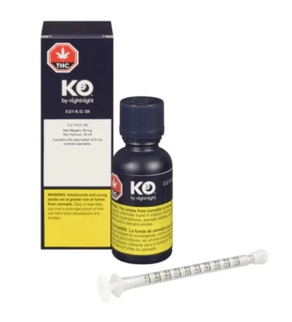 3:2:1 K.O. Oil, a formulation with a precise 3:2:1 CBD:CBN:THC ratio (30mg CBD + 20mg CBN + 10mg THC per 1ml x 30 ml). Developed by the creators of NightNight, this oil has a high potency profile ideally suited for users seeking THC products in addition to supercharged levels of CBN and CBD. This formulation contains high-purity CBD and CBN isolates and THC distillate, combined with over 20 botanical, indica-strain terpenes including Linalool, Myrcene, Limonene, and Beta-Caryophyllene.
