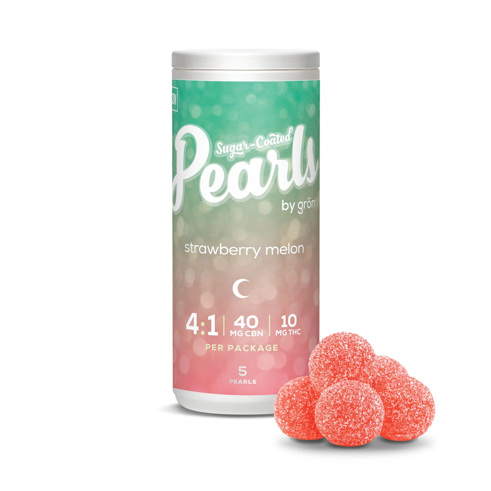 Strawberry Melon 4:1 CBN/THC Pearls. These gummies contain 40mg of CBN and 10mg of THC per package. Five gummies per pack. Each gummy contains 8mg of CBN and 2mg of THC per gummy.