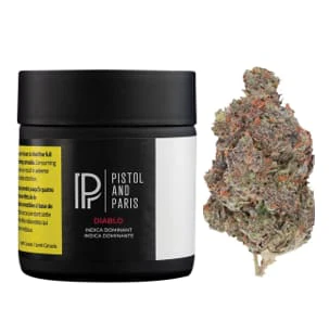 The enigmatic Diablo flower carries an air of mystery, with its origins believed to be a cross between MKU and Bubba Kush. Upon opening the bag, you’ll be greeted by intense, eye-watering waves of peppery diesel that signal the strain’s potent nature. The smoke follows suit, offering a spicy, gassy flavour that tingles the throat with each hit. Diablo acts fast, quickly inducing heavy, droopy eyes and a deeply relaxing full-body effect that settles in with ease. The buds themselves are sticky and dense, with a medium green hue and a thick coating of resinous trichomes. Pistol and Paris flowers are true craft, always produced with love and care, employing methods such as whole plant hang dry, cold cure and hand trim. Every step is done by hand to ensure the delivery of a premium experience.