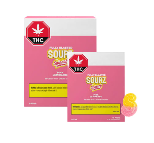 SOURZ by Spinach® Fully Blasted Pink Lemonade gummies have 10mg of THC per piece and the flavours of raspberry and lemonade! These dual-flavoured gummies are over-the-top with natural flavours and blasted with sour crystals. Enjoy 10 gummies with 10mg of THC per gummy and 100mg of THC per pack.