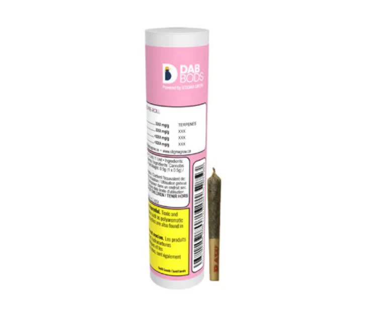 This Dab Bods Resin Infused Pre-Roll features Pink Frozay. This cultivar follows the lineage of Rozay and Bacio Gelato. Alluding to sour citrusy overtones followed by sweet fruit and spicey undertones, this resin infused pre-roll gives you potent THC with an added boost of cannabis terpenes.